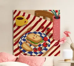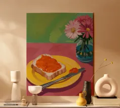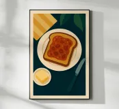 Un motivo stilizzato per la colazione in stile moderno di metà secolo: una fetta di pane tostato marrone dorato con marmellata di fragole fruttata, servita su un piatto con burro e un coltello. Forme chiare, colori caldi e uno sfondo tranquillo rendono questo poster un perfetto richiamo visivo per la cucina o la sala da pranzo.