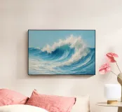 Quest'onda oceanica si alza e si arriccia con un movimento ampio e scultoreo. La pennellata strutturata conferisce alla superficie una qualità quasi pittorica, mentre i gradienti blu vividi si infrangono in una schiuma luminosa. Una stampa perfetta per case al mare, bagni o interni moderni che desiderano energia, movimento e calma da acqua salata.