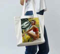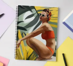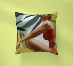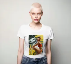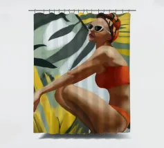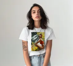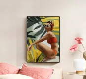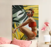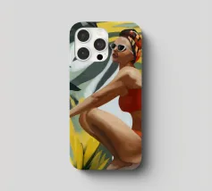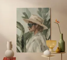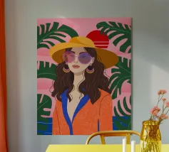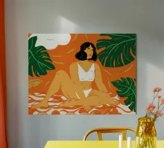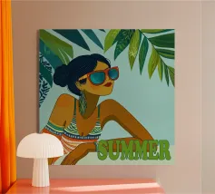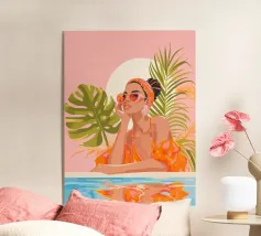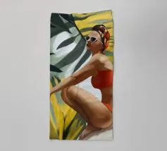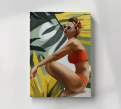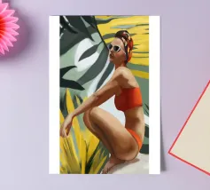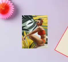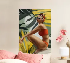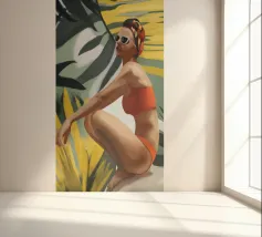 Un ritratto audace e solare che trasmette il fascino dell'estate vintage. Questo dipinto digitale presenta una donna sicura di sé in bikini rosso, accovacciata con grazia su uno sfondo di foglie tropicali sovradimensionate e fogliame dorato. Gli occhiali da sole a occhi di gatto e il vivace foulard strizzano l'occhio alla moda rétro, mentre i tratti pittorici sciolti e la tavolozza calda creano un'energia dinamica ed espressiva. Una celebrazione della femminilità, del calore e dello stile senza tempo: questo pezzo irradia vibrazioni vacanziere, ritmo tropicale e spensierata sicurezza di sé.
