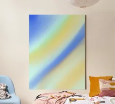 Una miscela morbida e ariosa di blu, verde e oro sabbioso che evoca la sensazione di una dolce brezza marina su una spiaggia illuminata dal sole. Il movimento fluido suggerisce calma, libertà e la semplicità della natura.