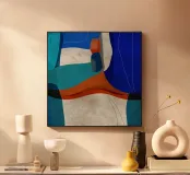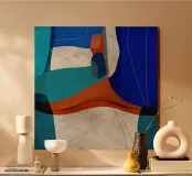 Opera d'arte astratta di Roberto Moro con una composizione di forme geometriche e colori vivaci: tonalità di blu, verde acqua, arancio, rosso-arancio e grigio-bianco tenue. Forme grandi e sovrapposte creano un senso di profondità e movimento all'interno dell'immagine. Linee nere sottili e contrastanti si intrecciano in tutto il disegno, aggiungendo ulteriore consistenza e interesse visivo. Le forme sono stratificate e sembrano fluttuare nello spazio. Lo stile è espressivo e non rappresentativo. I colori e le texture creano un'atmosfera dinamica ed energica.