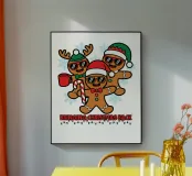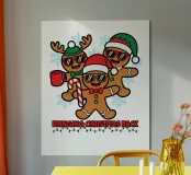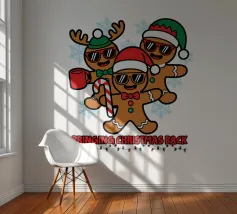 Tre personaggi di pan di zenzero sono vestiti a festa con occhiali da sole, cappelli da Babbo Natale e una tazza, in piedi tra fiocchi di neve. Trasudano uno spirito natalizio divertente e giocoso, con il testo "Bringing Christmas Back".