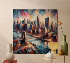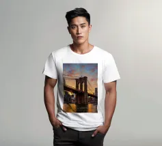 Una vibrante opera d'arte in stile pittura a olio del ponte di Brooklyn al tramonto, che cattura la luce dorata che si riflette sull'East River e sullo skyline di New York.