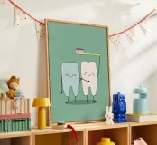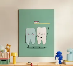 Un'illustrazione simpatica e amichevole con due denti sorridenti che condividono uno spazzolino. Progettata per rendere la cura dei denti divertente e alla portata di tutti, questa opera d'arte incoraggia le sane abitudini in modo delicato e allegro. Perfetta per i bagni dei bambini, le camerette, le nursery o gli spazi pediatrici, aggiunge un tocco moderno e rilassante, portando sorrisi ed energia positiva.