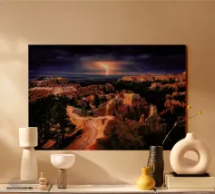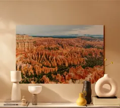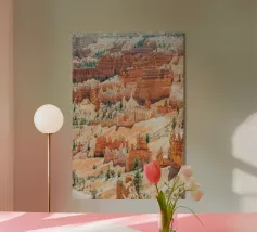 This Bryce Canyon photography captures the unique beauty of the natural landmark. The photograph showcases the vibrant hues and textures of the rock formations. The artist (kathrinmay) has captured the unique colors & winding paths of the formation.