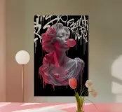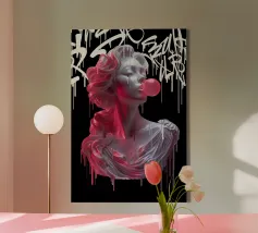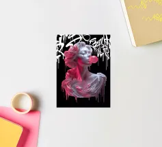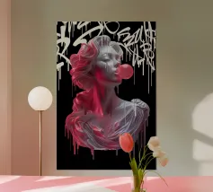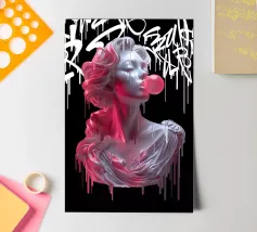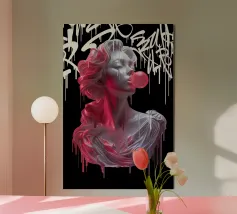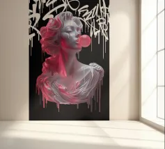 "In questa vibrante opera intitolata "Bubble Athenea", l'iconica dea greca della saggezza subisce una svolta stilistica verso la pop art. Pur mantenendo l'eleganza propria delle divinità classiche, Atena è presentata con una freschezza e un colore che la trasportano in un universo urbano e moderno, circondata da graffiti e street art con colori eleganti e ad alto contrasto, che fondono classicità e modernità".