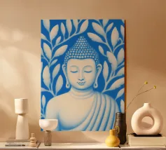 Questa sublime opera d'arte cattura la tranquillità senza tempo del Buddha, il cui volto irradia una profonda serenità interiore. Nello stile di una moderna xilografia o linoleografia, l'immagine affascina con linee chiare e una tavolozza di colori ridotti di blu, verde e crema che creano un'atmosfera rilassante. L'influenza dell'iconografia tradizionale asiatica è inconfondibile, ma la raffigurazione è al tempo stesso fresca e minimalista, per un fascino universale. Una finestra sulla consapevolezza sulla parete o su altri prodotti.