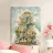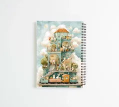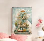 Una deliziosa illustrazione pittorica verticale di una stazione ferroviaria di coniglietti immersa tra nuvole sognanti. L'edificio è animato da affascinanti personaggi coniglieschi: alcuni salgono su treni colorati, altri chiacchierano sui balconi o leggono gli orari. Le pareti verde pastello, i tetti in mattoni e i fiori in fiore aggiungono calore e gioia a questa incantevole scena di viaggio. Perfetto per l'arredamento delle camere dei bambini o per le stampe di racconti stravaganti.