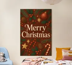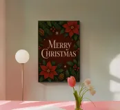 Una calda ed elegante illustrazione natalizia con vibranti stelle di Natale, rami di pino, bacche e stelle dorate che circondano un messaggio senza tempo di "Buon Natale". I ricchi rossi e i verdi intensi creano un'atmosfera classica e festosa, perfetta per interni accoglienti, angoli regalo e decorazioni stagionali.