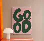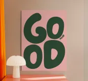 BUON UMORE Una chiara dichiarazione tipografica a grandi lettere. Moderna, senza tempo e piena di energia positiva. Questo design pone un forte accento e dona leggerezza e buon umore a qualsiasi ambiente: perfetto per soggiorni, uffici o spazi creativi. Colori: rosa / verde