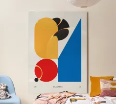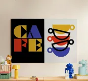 Questo poster combina una tipografia audace con tazze da caffè colorate e minimaliste. Perfetto per gli amanti del caffè e dell'arredamento contemporaneo.