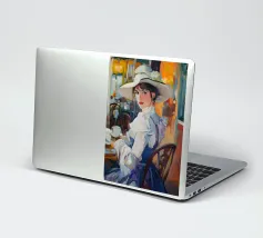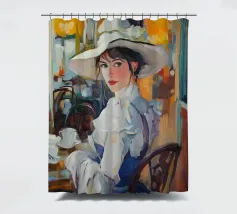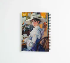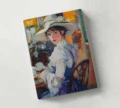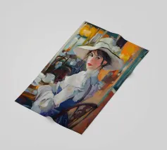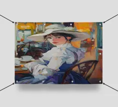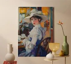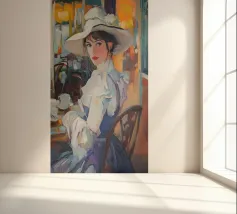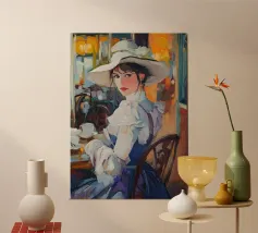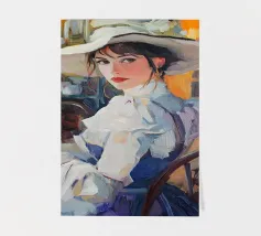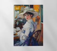 Un dipinto a olio di un'elegante signora con un cappello bianco e un vestito blu seduta al tavolo con un caffè, in un caffè di Parigi, in stile vintage, impressionista, con illuminazione dorata, una tavolozza di colori arancioni, dettagli ricchi, un'atmosfera calda, un'atmosfera vintage, texture della pittura a olio, pennellate, illuminazione impressionista e un'estetica vintage.