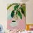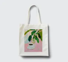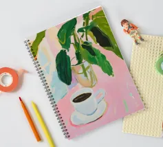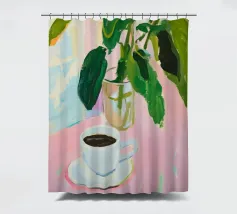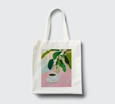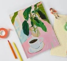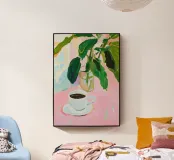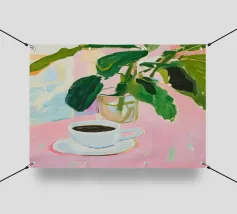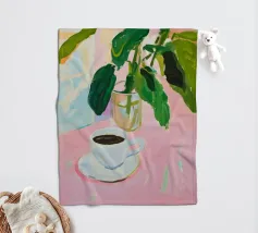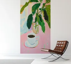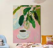 Ein Acrylgemälde mit einer Kaffeetasse und einer Pflanze in einer Vase auf einem rosa Tisch, mit sichtbaren Pinselstrichen.