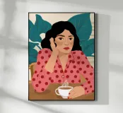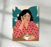 A portrait of a woman in a red polka dot top, thoughtfully holding a cup of coffee. Her contemplative expression and chic style create a sophisticated, modern, and relatable moment.