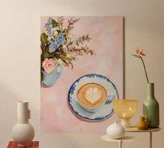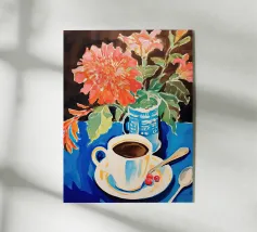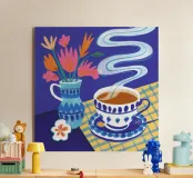 Illustrazione stravagante di una tazza di caffè fumante in una tazza a scacchi blu e bianchi, con fiori stilizzati che fluttuano sopra di essa, su uno sfondo blu scuro e ondulato.
