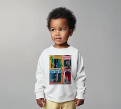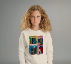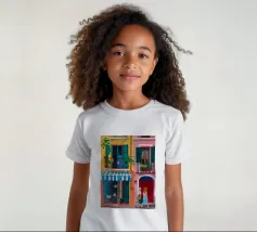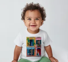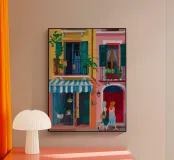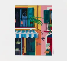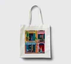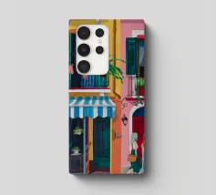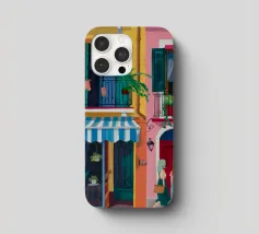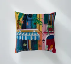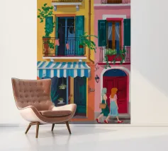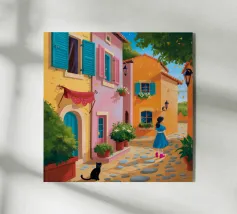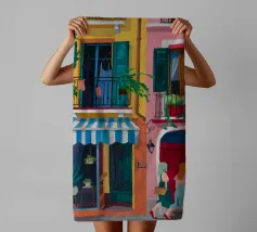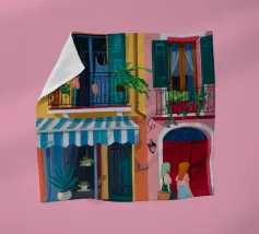 A charming European street scene featuring a storefront, possibly a cafe or shop, with a classic blue and white striped awning. A person is seated at an outdoor table, surrounded by colorful buildings adorned with balconies and flowers.