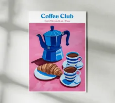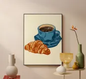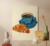 Un'accogliente illustrazione digitale in stile pittorico, che mostra una calda tazza di caffè con un croissant al burro.