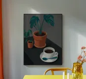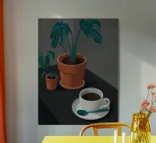 Una natura morta semplice e lunatica di una tazza di caffè nero accanto a una pianta di monstera in vaso. L'illuminazione scura e d'atmosfera crea una scena mattutina sofisticata, calma e contemplativa.