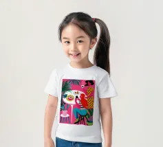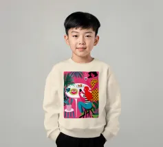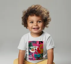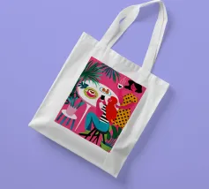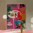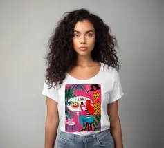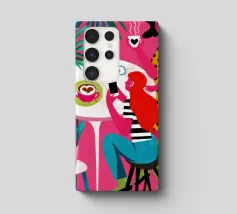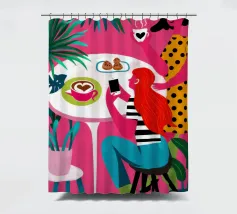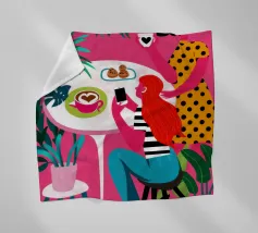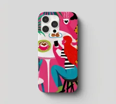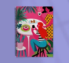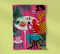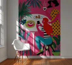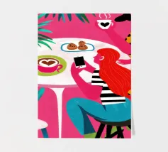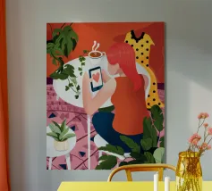 Un'illustrazione dinamica ed energica di una donna con un top a pois rossi che prende un caffè in un bar vivace e caotico. La scena è piena di motivi audaci, piante rigogliose e un'atmosfera vivace.