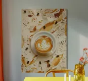 caffè latte art tazza da caffè piattino chicchi di caffè schiuma bevanda bevanda cappuccino espresso caffetteria caffè mattina colazione marrone bianco cremoso bevanda calda tazza in ceramica decorazione astratta