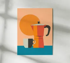 Una natura morta minimalista presenta una caffettiera argentata e due tazze da caffè gialle, pronte per essere riempite, su uno sfondo viola intenso.