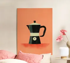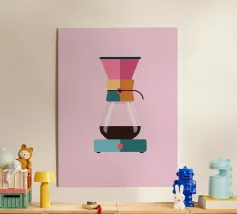 Illustrazione grafica di una caffettiera in azione, su uno sfondo rosa intenso. La rappresentazione moderna e stilizzata è un perfetto omaggio all'arte e al rituale del caffè speciale.
