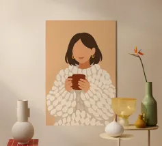 Una donna che tiene in mano una tazza di caffè caldo nella morbida luce del mattino. I toni delicati e le linee semplici ne fanno un'opera perfetta per le mattine lente e le routine tranquille.