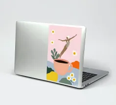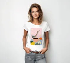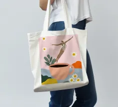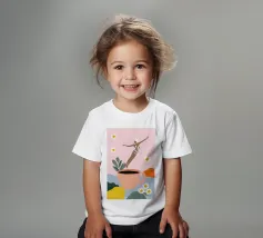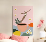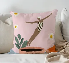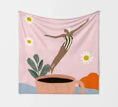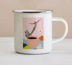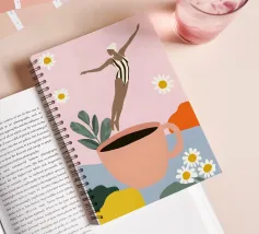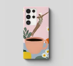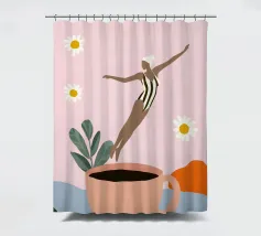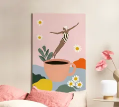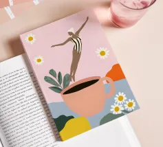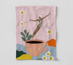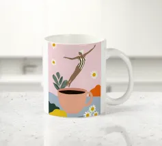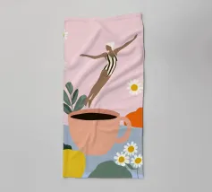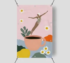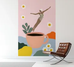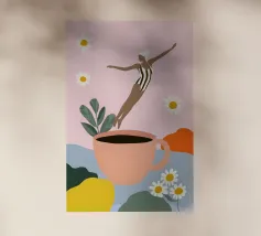 Una scena giocosa con un nuotatore in costume a righe bianche e nere che si tuffa in una tazza di caffè gigante color cipria. Il cielo rosa tenue, le allegre margherite e le forme solari degli agrumi aggiungono fresca energia mattutina. Le forme minimaliste e i colori pastello creano un'atmosfera moderna e stravagante che ricorda il primo sorso della giornata.