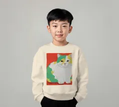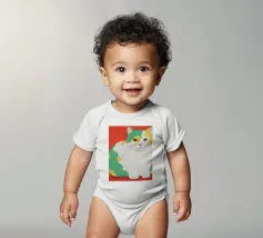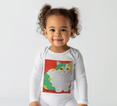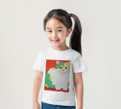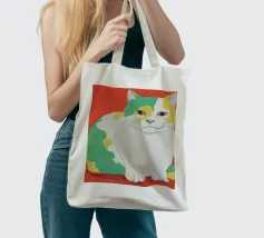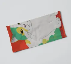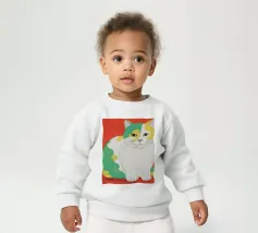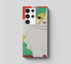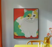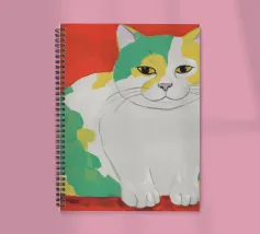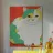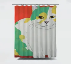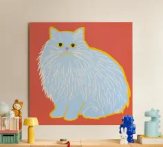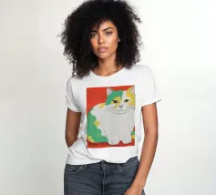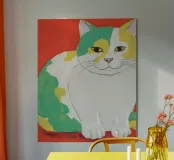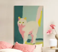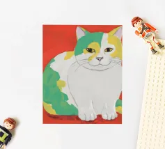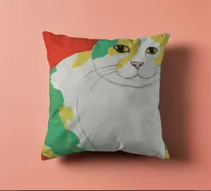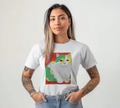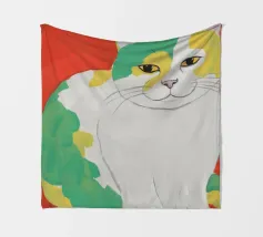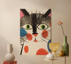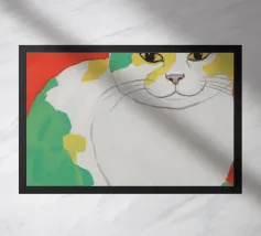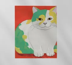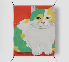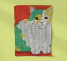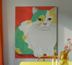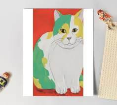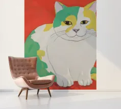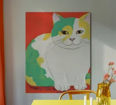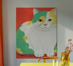 Ritratto stilizzato di un gatto calico con distinte macchie verdi e arancioni sulla sua pelliccia bianca. Il gatto ha un'espressione gentile ed è collocato su uno sfondo rosso deciso, che mette in risalto il suo manto unico.
