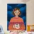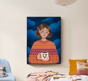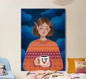 Questo dipinto mostra una persona con i capelli corti e castani che indossa un maglione a motivi arancioni e viola. La persona tiene in mano una tazza bianca. Lo sfondo è un cielo blu nuvoloso, che contribuisce a rendere l'opera accogliente e calda.