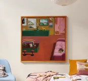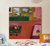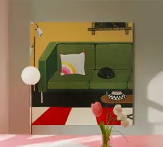 A cheerful interior boasts a comfortable pink sofa, bright red stools, a prominent rainbow artwork on the wall, and a view into an adjacent room with green walls.