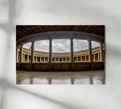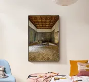 L'immagine mostra un interno storico della Casa de Pilatos di Siviglia, un palazzo del XVI secolo con influenze architettoniche mudéjar, gotiche e rinascimentali. Le pareti sono completamente ricoperte da piastrelle decorate con motivi geometrici e floreali nei toni del blu, del verde e del marrone. Queste piastrelle sono tipiche dell'arte mudéjar e riflettono la diversità culturale dell'Andalusia. Il soffitto è costituito da pannelli in legno dorato con complessi ornamenti e rilievi che documentano la maestria dell'epoca.