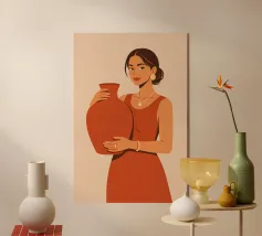 Una donna di spalle, vestita con un fluente abito dorato. Lo sfondo rosa tenue risplende di calore, circondato da semplici forme di ceramica. Questo pezzo cattura un momento tranquillo e riflessivo in un ambiente da sogno.
