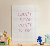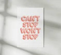 Design dinamico "Can't Stop Won't Stop" con una tipografia moderna e audace, piena di energia e determinazione.