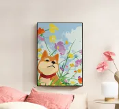 cane fiori nuvole cielo blu erba collare rosso campo giornata di sole primavera all'aperto natura fiori gialli fiori viola fiori arancioni steli verdi modello floreale animale domestico animale paesaggio colori vivaci