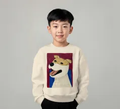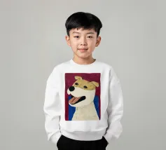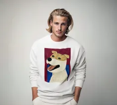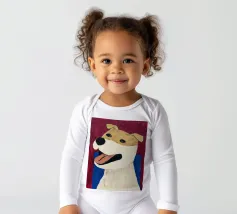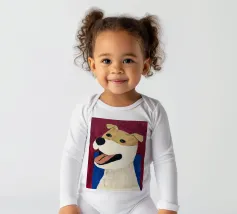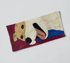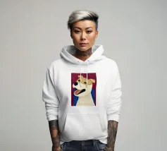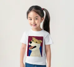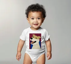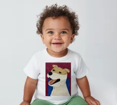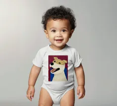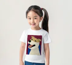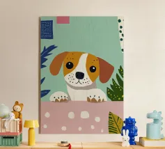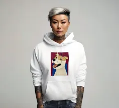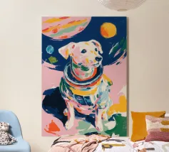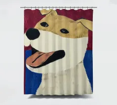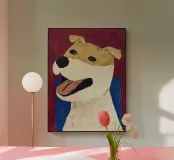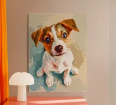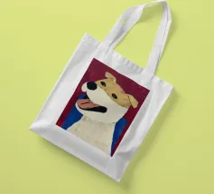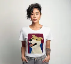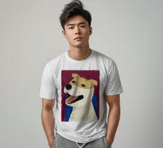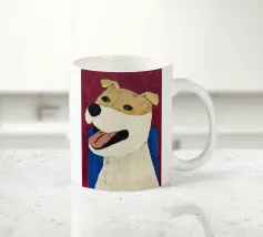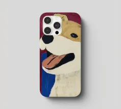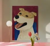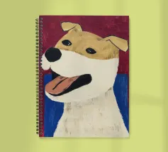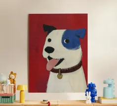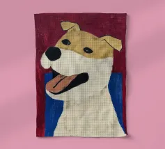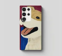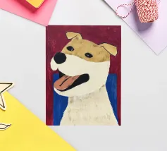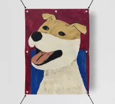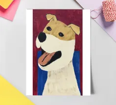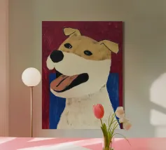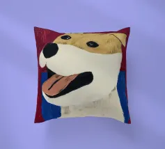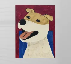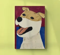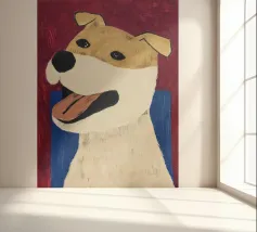 Illustrazione di ritratto di cane giocoso su sfondo rosso e blu, che mostra un cucciolo felice con la lingua fuori e un'espressione gioiosa.