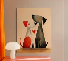 Various stylized dogs of different breeds and colors are playfully arranged in a repeating pattern against a light background. The illustration is fun, quirky, and celebrates canine diversity.