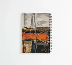 Un paesaggio astratto che raffigura strati profondi di canyon con bande orizzontali di rosso scuro, arancione, nero e grigio, che trasmettono un senso di profondità geologica e di terreno accidentato. Stile Bob Nugent / de Stael.