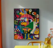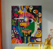 A vibrant mix of shapes and colors create a lively and dynamic composition. This painting captures the energy and spontaneity of artistic creation, inviting viewers to revel in the beauty of creative chaos.