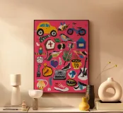 Uno sfondo rosa acceso riempito di vari oggetti giocosi ed eclettici, tra cui una macchinina, una chitarra, una scarpa, un orologio e altri oggetti vari.