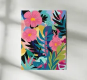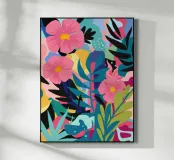 Un'esplosione vibrante e caotica di fiori astratti in rosa, blu, arancione e verde, che creano una composizione floreale gioiosa ed energica.
