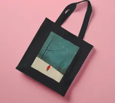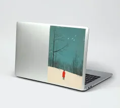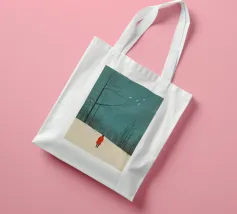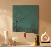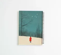 Una donna con un cappotto rosso in piedi nella neve, con alberi e cielo sullo sfondo. Un'illustrazione semplice e minimalista, con una texture granulosa e un colore turchese. La scena raffigura la stagione invernale e un paesaggio freddo e innevato con uccelli in volo.