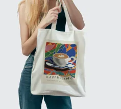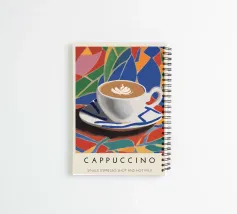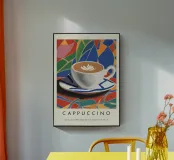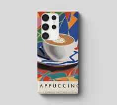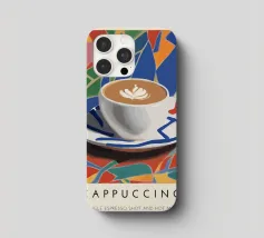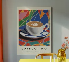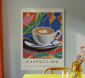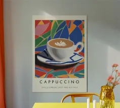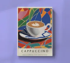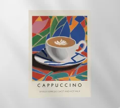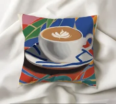 cappuccino tazza di caffè arte del caffè latte art piattino bevanda bevanda calda schiuma colorato sfondo multicolore forme geometriche motivo a mosaico disegno a piastrelle colori vivaci illustrazione di una bevanda tazza di ceramica colazione rinfresco tema del caffè cultura del caffè