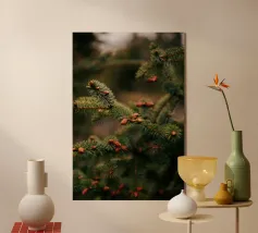 Cardellini su un albero di conifere plexiglass