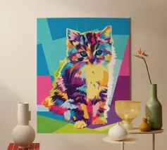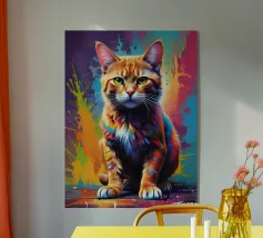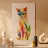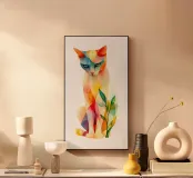 Una vivace illustrazione geometrica di un gatto seduto con forme sovrapposte dai colori dinamici, abbinata a elementi astratti a forma di foglia per un design moderno e creativo.