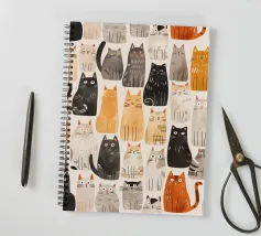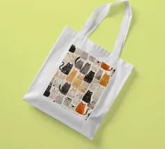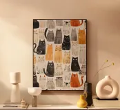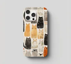 Un'illustrazione digitale 2D senza soluzione di continuità, giocosa e colorata, con una serie di gatti stilizzati ed eccentrici in varie pose. L'illustrazione cattura il fascino delle espressioni feline, da quelle curiose a quelle soddisfatte, rendendola un disegno perfetto per gli amanti dei gatti e per l'arredamento ludico.