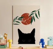 In basso è visibile la sagoma di un gatto, con le orecchie e gli occhi che fanno capolino nella scena. In alto, un cerchio rosso ricorda un sole strutturato, accompagnato da foglie verdi.