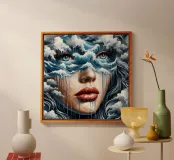 Painting of woman in the sea with waves surrounding her.