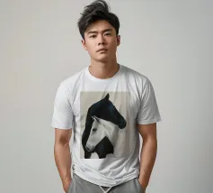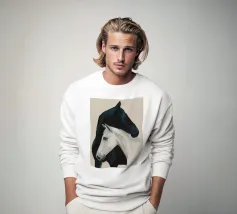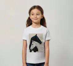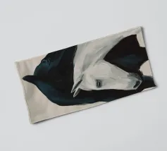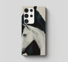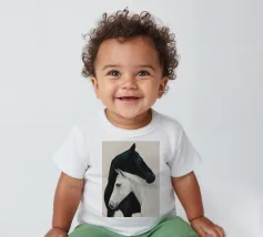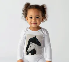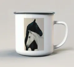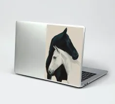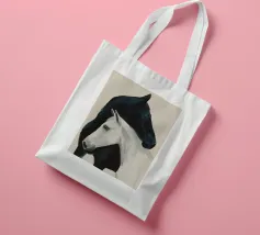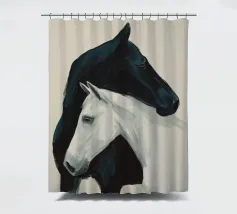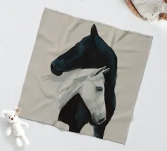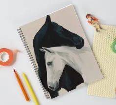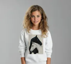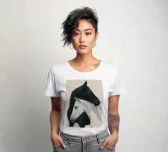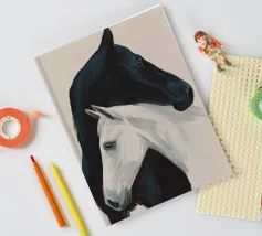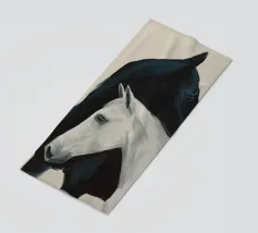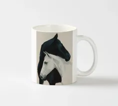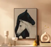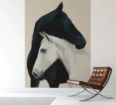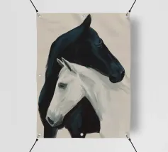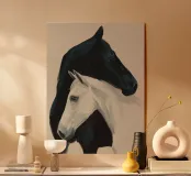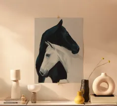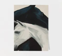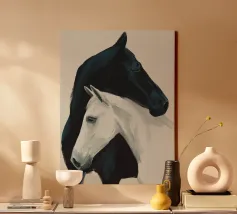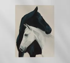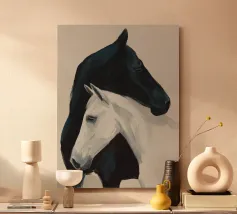 Un semplice dipinto raffigurante due cavalli che condividono un momento di calma e tranquillità.