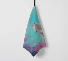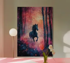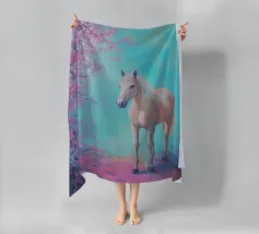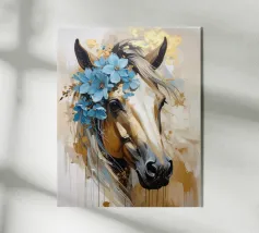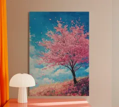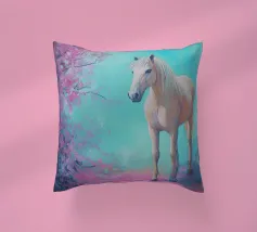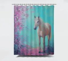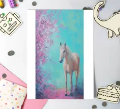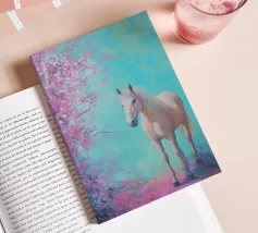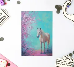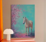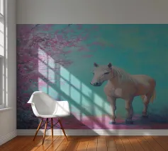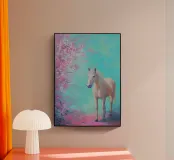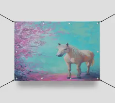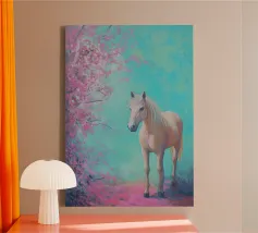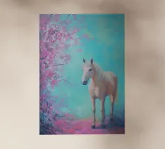 Dipinto a olio di un cavallo arabo sotto un albero di ciliegio in fiore, con colori pastello rosa e blu, in un paesaggio primaverile.